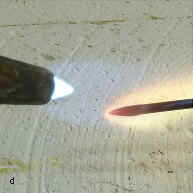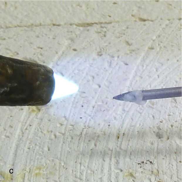 Picos de soldadura están hechos de muchos materiales: tungsteno, niobio y acero para nombrar algunos, pero el titanio es mi favorito. El titanio es un metal no reactivo que no puede ser soldado, así que hay cero posibilidad de que la selección para el metal de soldadura. Lo primero con un titanio nuevo agradable escoger (imagen a) es "tratar". Sumerja la punta de la hoja de flujo (imagen b) y calentar hasta que el flujo va claro (imágenes c y d). Una vez que ha pasado claro y se vuelve a calentar, el flujo será pegajoso; Esto ayudará con la cosecha encima de la soldadura. Vez y un tiempo puede ser necesario tratar de volver a la selección.