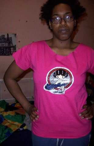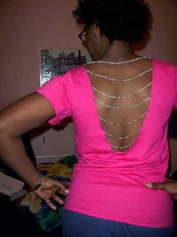 tomar una camiseta aburrida y jazz para arriba con un cuello amplio sexy/el collar de hombro y diamante cortados costados y mangas.Hice esto en TechShop San José. Tienen un maniquí ajustable Vestido de forma que hace más fácil trabajar en la camisa y