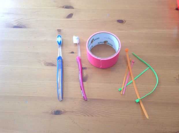 ¿Cansado de las cadenas sucias, grasientas? Este práctico gadget es para ti!Paso 1: Reúna los suministros.1. 2 cepillos de dientes2. rollo de cinta adhesivaPaso 2: Cinta los cepillos de dientes.Paso 3: Limpieza feliz!Use una solución suave de jabón p