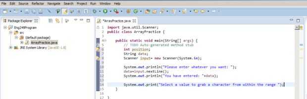 Tipo "System.out.print ("Seleccione un valor para un personaje dentro de la gama del gancho agarrador");" en el espacio de paso 14.