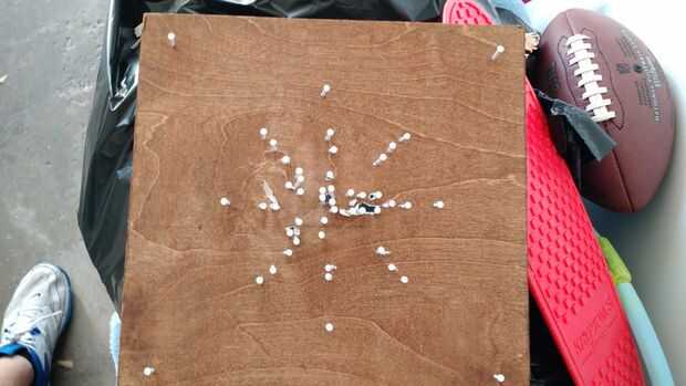 Ahora, encontrar el centro de la madera contrachapada y clavar el arte. Añadir tantos clavos como alrededor de cada borde negro. Cada rincón debe tener un clavo. Una vez que estés satisfecho con la colocación de clavo añadir ocho más clavos que rodea la obra de arte. Cuatro clavos en cada esquina y cuatro a cada lado más cercano a la obra de arte de las uñas de la esquina. Les recomiendo tomar una fotografía de la parte superior y dibujar líneas usando un editor de fotos online como pixlr.com/editor para que sepas lo que la forma de las uñas resulta para ser. Una vez que está todo completo empieza a rasgar el papel. Esta parte es bastante fácil, pero si se atasca el papel un cúter y un destornillador pueden rasgar el papel extra fácilmente sin dañar la madera.
