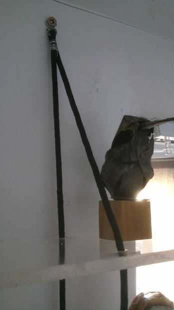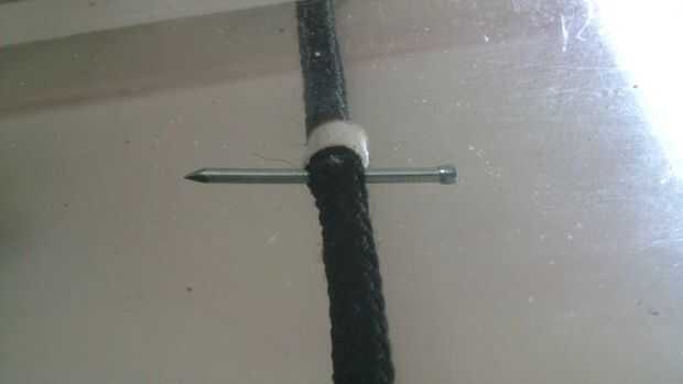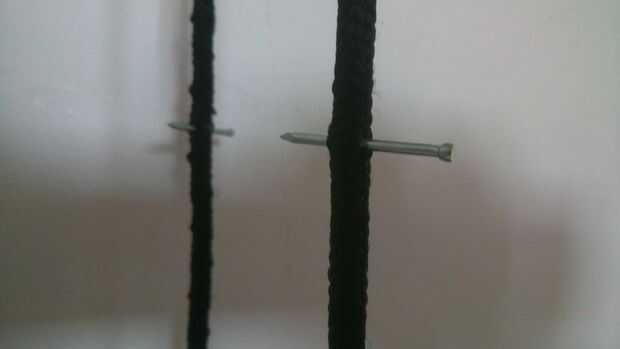 Tire del cordón por los agujeros. Asegúrese de que la primera tabla es nivel. Las cuerdas más cercano a la pared será más cortas que la frente dos. Sacador de clavos a través del cable para mantener la Junta en su lugar. Cuando la primera tabla es nivel puede medir el cable donde usted quiere las otras tablas. Usé un pencel color blanco