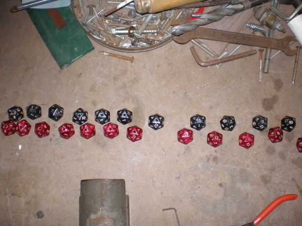 2. dados. Muchos de ellos. El color es de su elección. Cada dado es de 2cm (0,8 pulg.) medido de lado a lado, no entre los vértices. Para encontrar la longitud deseada de la cadena futura, simplemente tome un pedazo de cuerda y poner a tus pantalones, encontrar la cantidad apropiada y Compruebe la longitud... Recuerde que debe hacer la medición cuando tienes tus pantalones. Si solo pones en la mesa y prueba - obtendrás resultados diferentes. Que era satisfactorio para mí fue de 50 cm (20.). Margen de error sería de alrededor de 5 cm (2 pulg.). Asegúrese de comprar varios dados más de lo necesario, en caso de errores. He comprado 28 y finalmente puesto 23 en una cadena (con la sola pérdida durante la perforación experimental).