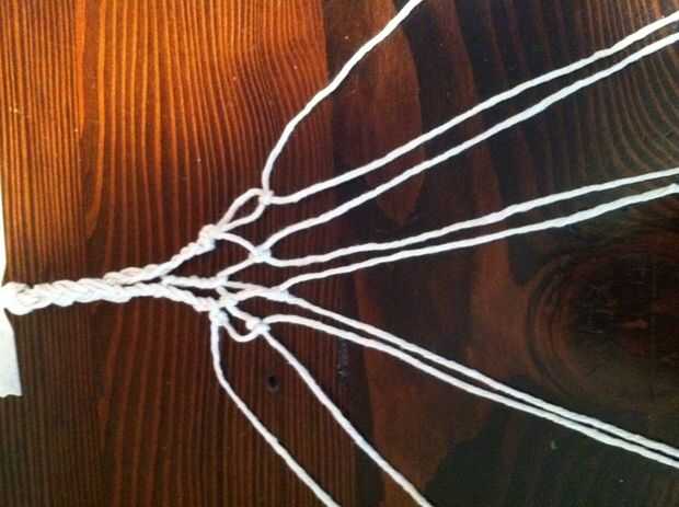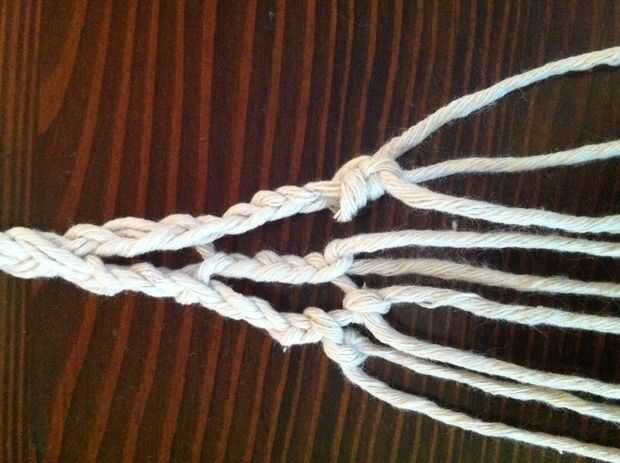 a partir de la izquierda (o derecha, si lo prefiere, solo encuentro más fácil de seguir en la misma dirección, de izquierda a derecha, de izquierda a derecha, en lugar de ir hacia adelante y hacia atrás) tomar las dos primeras cuerdas y les nudo. Tome las dos cuerdas y les nudo. Continuar hasta que hay cadenas de cero o uno a la izquierda. Para la siguiente fila, deje una cadena desatada en la izquierda, tomar la segunda cadena (desde el primer nudo) y la tercera cadena (desde el segundo nudo) y les nudo juntos.