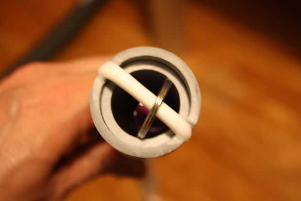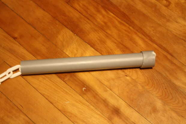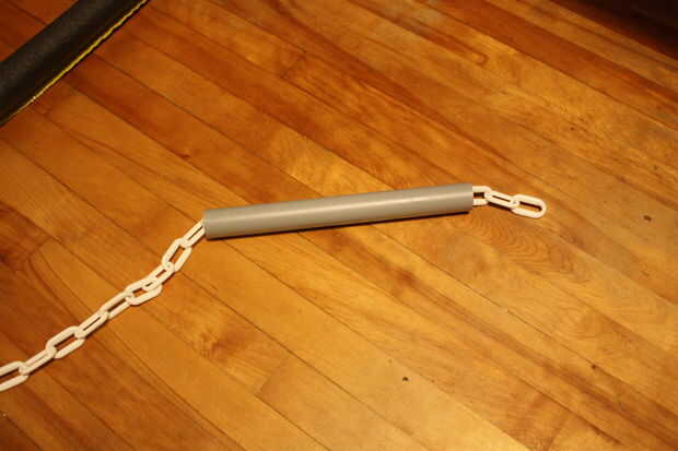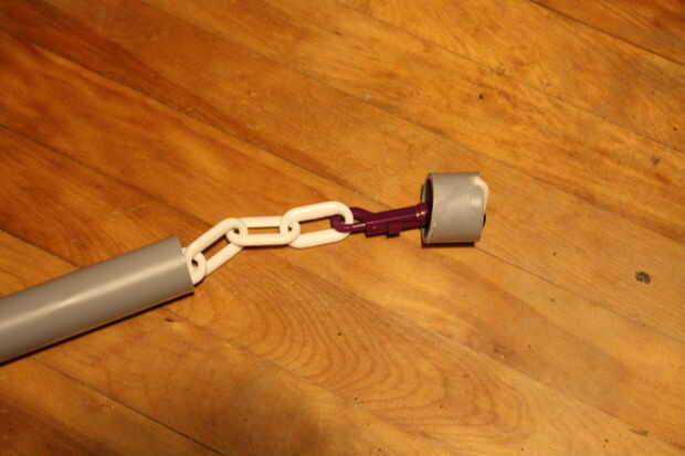 2. Si desea probar la Asamblea (altamente recomendada), recorren la longitud de la tubería del bastón de mando de la cadena y asegurar el enlace final para el snap hook/mosquetón. Montar la tapa sobre el extremo de la batuta y tire la cadena tensa para asegurarse de que la Asamblea es segura. Si no es así, eliminar el pegamento antiguo con papel de lija en un área bien ventilada (respirar en el polvo de la cola no es una buena IDEA) y volver a montar la tapa.