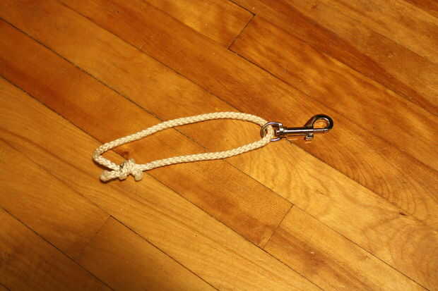 Para esta demostración, cuerda de nylon simple se utilizará para una manija. Pase la cuerda a través de la base del gancho de seguridad (o mosquetón) y atar en un nudo de lazo. Opcionalmente, se aplica una llama al nudo para sellarlo.