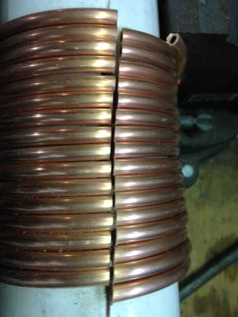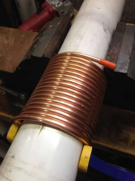 Tire de la bobina recién creada fuera de la tubería de PVC, doble la pieza que estaba en la muesca de corte hacia arriba y deslice la bobina en el PVC por lo que está presionando contra la prensa.  Mantenga la bobina apretada contra la prensa con una abrazadera.  Corte con cuidado la bobina en aros con la amoladora.  No te preocupes acerca de cortar el tubo de PVC.