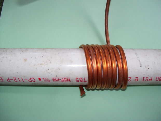En este primer paso sólo necesitaras el tubo de cobre y el pvc. Sujete el extremo de la tubería de cobre y el pvc en un lado, ahora empezar a envolver el cobre en el pvc mientras jala en el cobre para evitar que se doblen. Usted debe terminar con una bobina buena que parece pertenece en un todavía ;-)