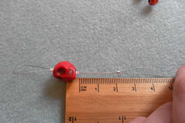 Coloque uno de los granos de cráneo en el hilo de abalorios y añadir una gota de presión debajo de él. Asegúrese de que los Chafas están cerrados firmemente. Añadir otro grano prensado cerca de dos metros de centro hacia abajo.