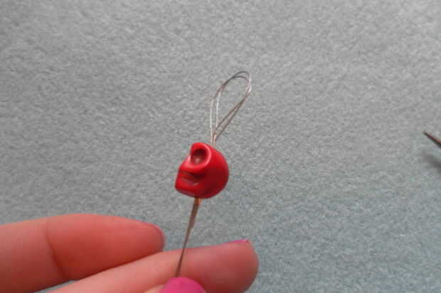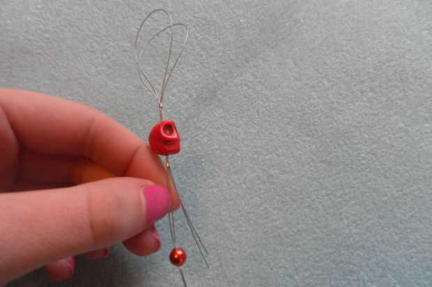 Para crear otro extremo pone un grano de la encrespadura y luego una tira de cráneo y otro prensado del grano en el alambre y doblan los extremos a través de. Hacer el lazo del tamaño que desee a continuación cerrar los Chafas con los alicates. Cortar el alambre sobrante después.