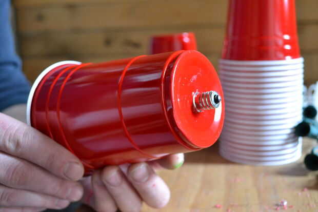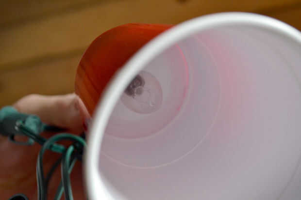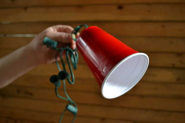 Inserte cada bombilla de luz C7 base a través del fondo de la taza de plástico, desde el interior para que la base de metal se extiende por el exterior. Luego atornillar la bombilla en el zócalo donde se trabe la taza en su lugar. Bombillas de luz C7 no obtendrá lo suficientemente calientes como para derretir la taza, especialmente cuando se usa al aire libre. Repita con todos sus vasos y bombillas. Colgar tu nueva cadena de luces de fiesta y llamar los amigos!