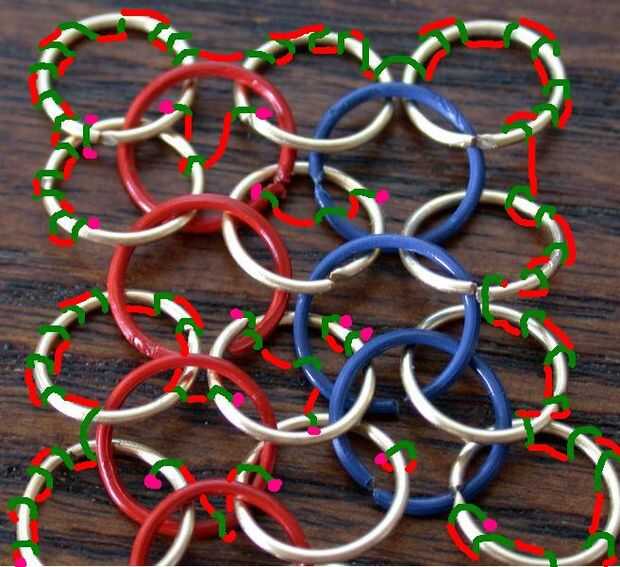 La puntada siguiente utilicé fue bucle alrededor de un anillo a la vez, varias veces. una vez que había atado el hilo alrededor del alambre, y a través de la lona varias veces, coloca una vez más, luego pasó al siguiente link. Ver segunda foto. Verde es el hilo por encima de la tela, y era rojo el hilo debajo de la tela. Los puntos rosados son nudos. Por favor disculpa mis pobres conocimientos de pintura de Microsoft.