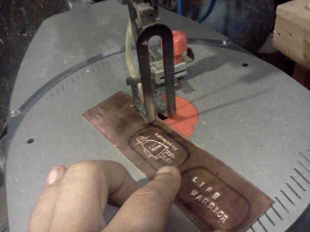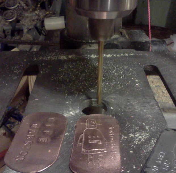 Ahora que puede ver las etiquetas de tiempo de terminar para arriba! Recortar las etiquetas usando una dremel, Sierra de calar o un par de tijeras. Encontrar un punto central en la parte superior de sus etiquetas y perfore un agujero un poco más grande que la etiqueta de la cadena, con un papel de lija fino acabado de los bordes y pulir las etiquetas un poco para conseguir un brillo en los arañazos. Para realmente darle un "pasado de la batalla" mirada algunos Brasso metal polaco y un trapo y ligeramente mano pulir las etiquetas (Tip: no polaco de la máquina les lleva gran parte de las manchas oscuras y martilladas del material)