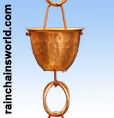 cadena de lluvia de cobre es un accesorio ampliamente utilizado que se une a un canal de tejado y lleva agua a la tierra. El agua así es recogido en un barril de lluvia o drenado lejos del edificio que se puede almacenar para uso posterior. Fácil instalar cadenas de lluvia es un reemplazo perfecto para bajadas de agua vieja. Disponibles en varios diseños, formas y acabados, crean un ambiente atractivo cuando se cuelgan de los aleros de la casa.