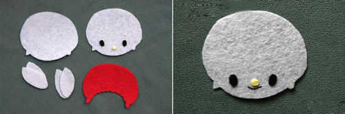 Corte de patrones de fieltro según diversos colores y formas necesitadas. Pegar los ojos y la nariz en la cara; coser la boca.