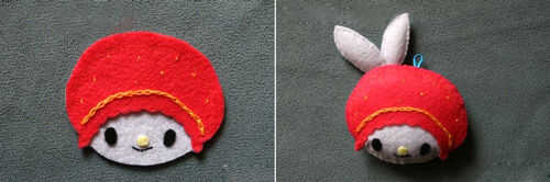 Decorar el sombrero por hilos amarillo y entonces la cosa con la cara. Hacer dos orejas con acolchado. Coser la parte posterior de la cabeza con cara y orejas. Deje un espacio para coser un círculo de cuerda en la parte superior de la cabeza. No se olvide de poner que acolcha en.