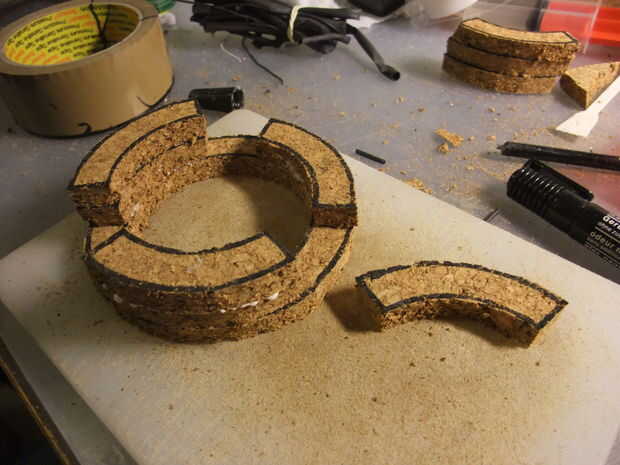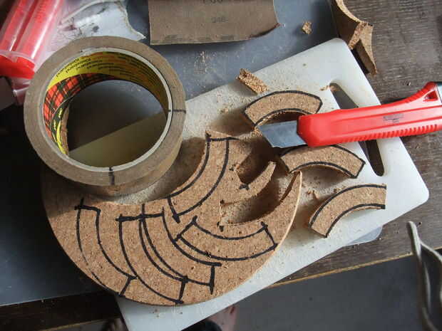dibujar un anillo en el corcho (con un edding por ejemplo) con un diámetro exterior de unos 10 cm y un diámetro interno de 7 cm. He utilizado un rollo de cinta de embalaje como una plantilla.