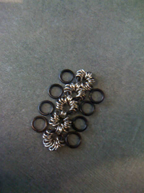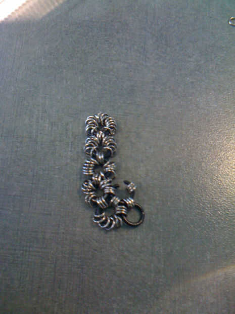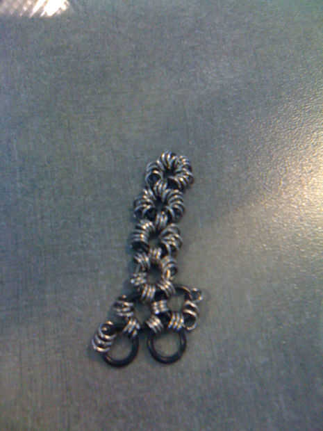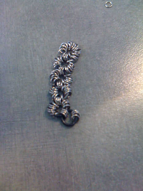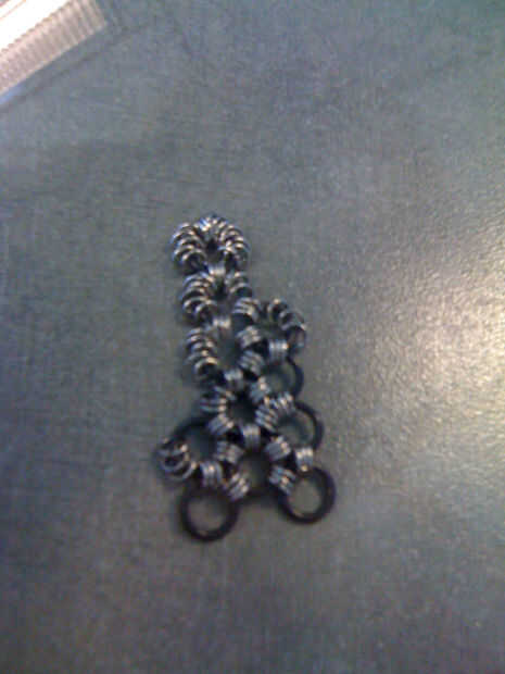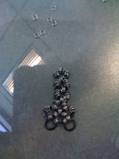 Abre otro anillo acero pase a través de los 3 anillos agregó en el paso anterior, a través de la 3 no utilizado en el último paso, 3 anillos de la sección siguiente y finalmente Agregue 3 anillos más de 4mm y cierre. Ahora repita por ambos lados.