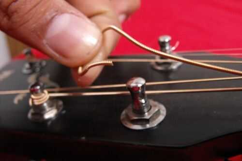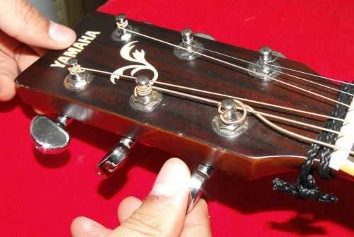 Así que empieza a quitar la cuerda e baja desenrollando la clavija de afinación - usted debe girar la clavija hacia el cuerpo de la guitarra - hasta que esté lo suficientemente flojo para que fácilmente puede tirar la cadena del agujero de la clavija.