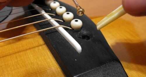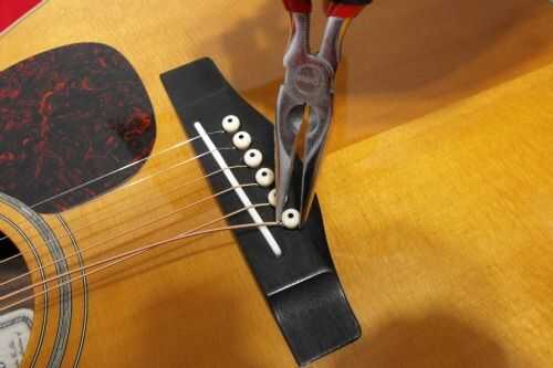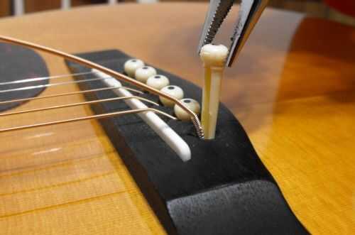 Una vez que el perno de puente está hacia fuera, simplemente retire el extremo de la bola de la cuerda del agujero. Puede descartar la cuerda antigua o mantenerlo si lo desea; no es necesario para él para el resto del proceso de reemplazo.