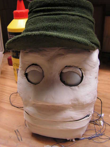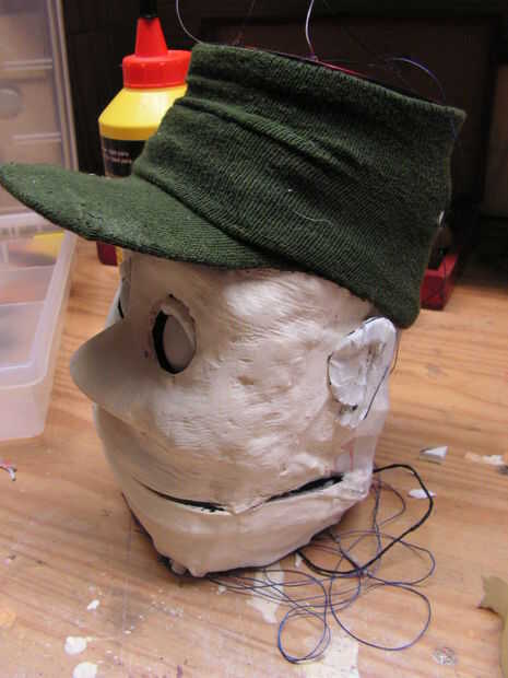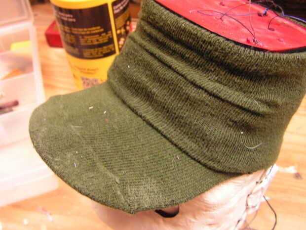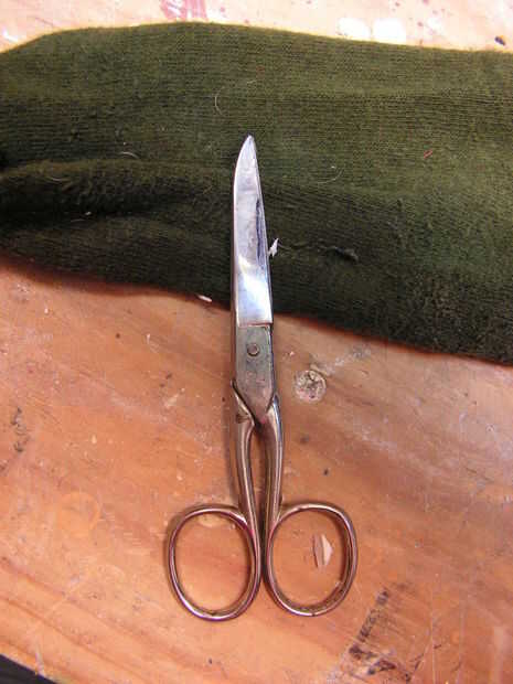 Ahora se trata de un calcetín viejo, y sólo se hace un corte... para hacer una tapa, junto a un trozo de cartón. Sus oídos están recibiendo forma.