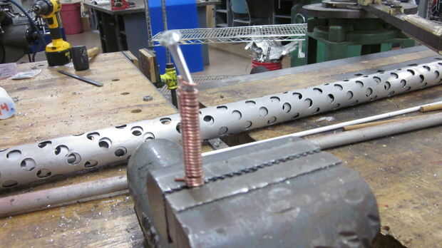 La forma más sencilla de todo lo fuera de forma hacerlo sin doblado es poner la barra vertical en el tornillo de banco, fijarlo con la abrazadera, luego lo retrocede bastante que pueda deslizar libremente pero las bobinas cant. luego martille la barra abajo. Fácil ¿verdad? ahora para llegar hasta la bobina y sacar que en negrilla y luego usarlo para la barra de la bobina del martillo. Si no puede conseguir la bobina entera hacia fuera no biggie, de volver a este paso. después del siguiente.