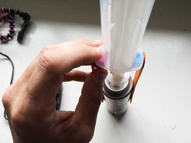 Echa un vistazo para asegurarse de que el movimiento de la jeringa puede hacer contacto con el botón de la tonta cadena. Añadir una carga de cola en las alas de la jeringa para mantenerlo agradable y seguro.