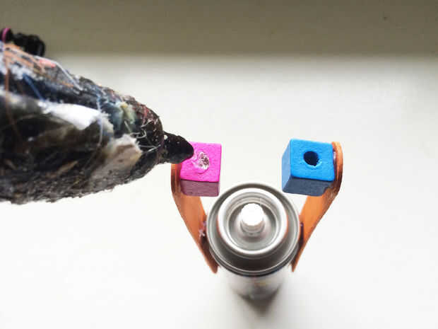 Echar pegamento en la parte superior de los cubos de su arte y agárrate las alas de la jeringa para que sea suspendida boca abajo con la parte de superior del émbolo hacia el botón de la tonta cadena.