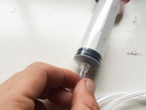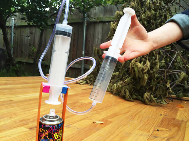 Simplemente comience con su jeringa de gatillo hacia atrás con una bolsa de aire, su detonante jeringa y lista para ser llenado con gas. Más largo es el tubo el ajoarriero, o al menos más anónimos u oculto puede ser. Ya que lo oculta, encontrará que desea un soporte en el extremo de la lata para mantener vertical. Va a cambiar dependiendo de su escondite. Ser creativo!