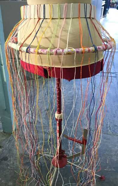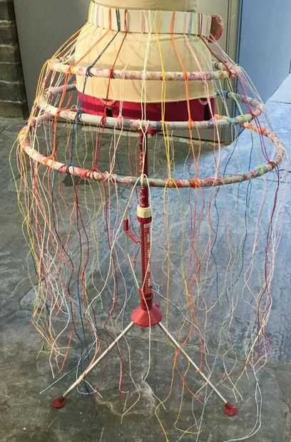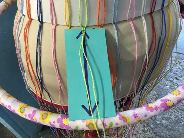 Adición de los aros era un pedazo de pastel. Primero trabajé el tamaño del boquete quería entre los aros y cortar un trozo de cartón para que el tamaño. Con mi pedazo de tarjeta podría medir cada cuerda y atar el aro en la distancia correcta de la cintura/último aro.