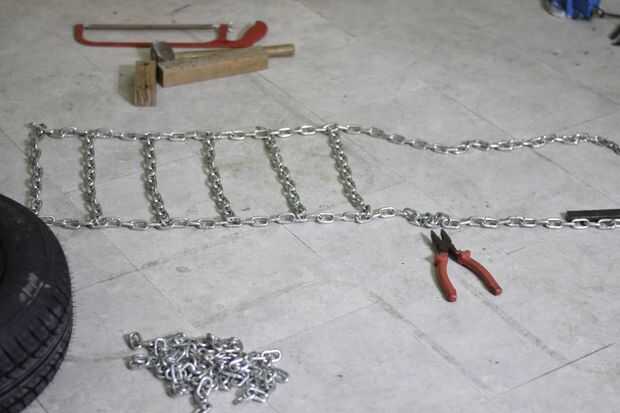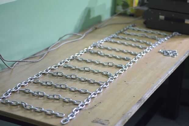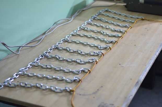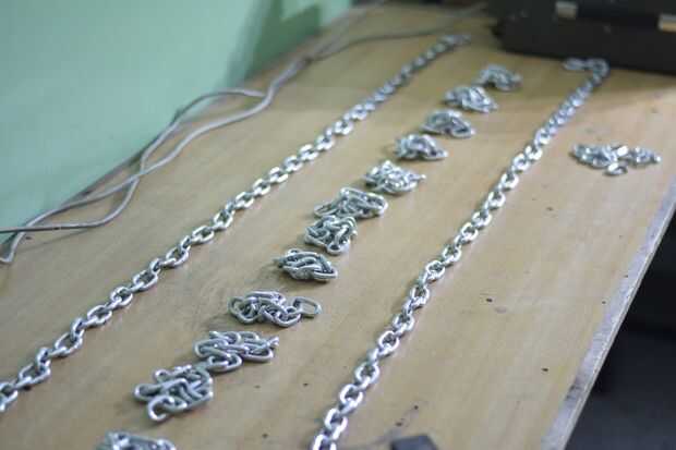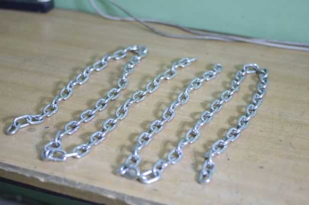 Pone la longitud de 5 pies y fijar la longitud de un pie a la cadena larga. Conecte cada uno después de cada cuatro enlaces. Añadir el enlace cortado y martillo que cierre con un martillo.