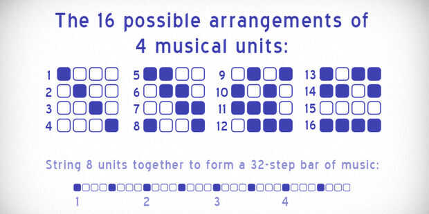 El ritmo es una secuencia de pulsos y los espacios (restos) entre los pulsos. Si tenemos en cuenta las posibles combinaciones de pulsos y silencios en una secuencia de cuatro unidades, hay 16 combinaciones podemos generar (2 ^ 4). Estas 16 combinaciones son los bloques de construcción musical, o ADN para construir todos los sonidos en la experiencia de cadete Dub. Un bar de música consiste en 8 de estos bloques de edificio de 4 unidades en secuencia.