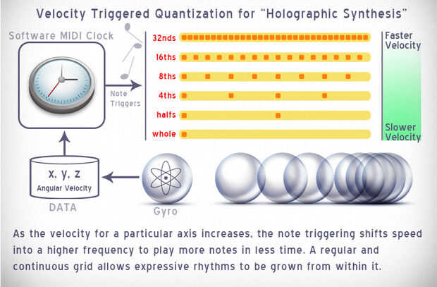 Cuando la velocidad es cero, mantener un período de descanso. El dispositivo comienza a leer los valores de rotación más alta, que provoca sonidos a un ritmo más rápido y más rápido. Tenga en cuenta que las posiciones Nota quantized son como ranuras en una cubitera que solamente están llenos de agua cuando la velocidad y la orientación. Esto significa que siempre podemos activar la nota para ser a tiempo y en ritmo, no importa cuán rápido o lento la bola está moviendo. Llegamos así a una solución de diseño que se enclavija aditivo. Moviendo más rápido que generamos más notas que jugar rápido y movimiento lento generamos menos notas que duran más. Mi solución actual aísla la longitud de la nota desde el momento en que se activa para una experiencia verdaderamente expresivo.