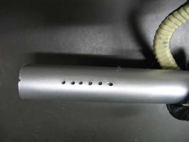 Cortar dos muescas en la parte superior de personal para estabilizar el cristal cuando está en su lugar. Luego perforar 6 abajo cada lado de la parte superior de la plantilla como se muestra. Los orificios de la parte son sostener las plumas, por lo que se pueden variar el número y tamaño de acuerdo a cuántas plumas que desea utilizar y cuánto están en la base.