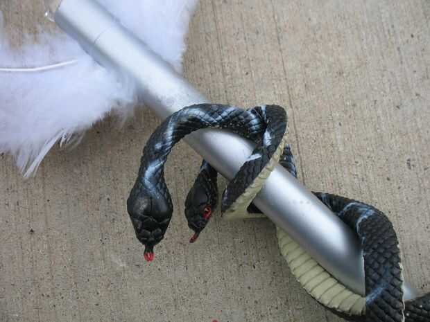 Envolver las serpientes alrededor del personal y fijar con un par de tramos de la línea de pesca. Asegúrese de permitir un margen en la parte superior de las plumas. Vas para sostener el personal cerca de 12 pulgadas hacia abajo desde la parte superior, así que Envuelva las serpientes con huecos donde fácilmente puedes agarrar hold y los dedos pueden tocar el tubo de PVC. Hay una razón para ello.