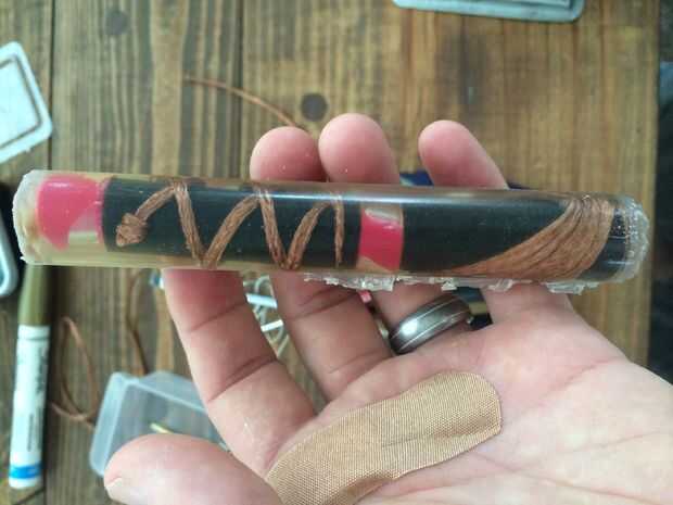 Después de preparar mi molde, descubrí que mi epoxi «bueno» se había secado para arriba (el lápiz plateado en algunas primeras fotos se hace con el epoxi «bueno»), así que usé mi epoxy de calidad inferior. (color ligeramente amarillo, no es perfectamente transparente, más propenso a pequeñas burbujas) La primera foto es la pluma después de ser retirado del molde, la segunda es después de separadas las piezas y quité el epoxy extra y lápices de colores y luego los había montado en la herramienta de torno.