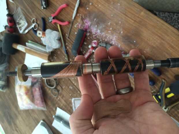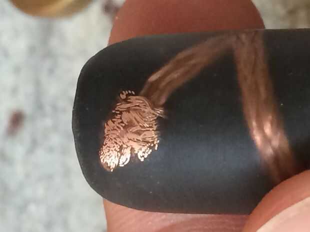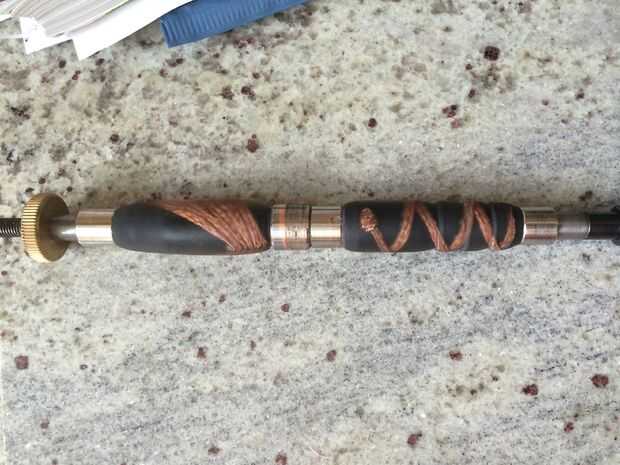 La tercera imagen es las partes de la pluma después de terminó girando en el torno. Como se puede ver en la cuarta foto, decidí cortar directamente el cobre en varios lugares con el fin de reducir el diámetro total y el peso de la pluma.