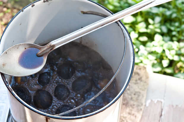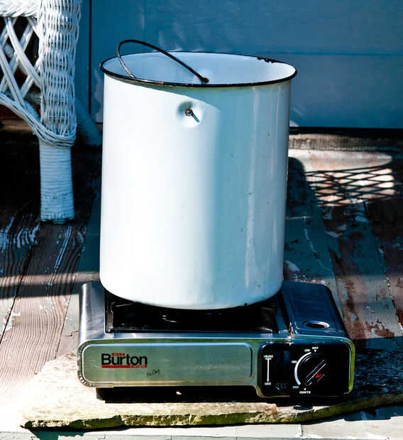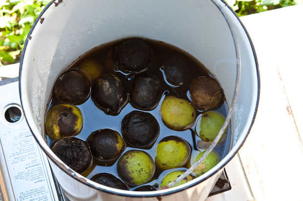 4. poner a hervir, baja el calor y cocinar a fuego lento durante una hora a dos. Lo hice en un quemador de butano pequeña fuera, ya que es bastante apestoso. Quítate el calor y deje que las tuercas de remojo durante la noche.