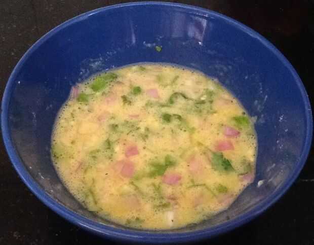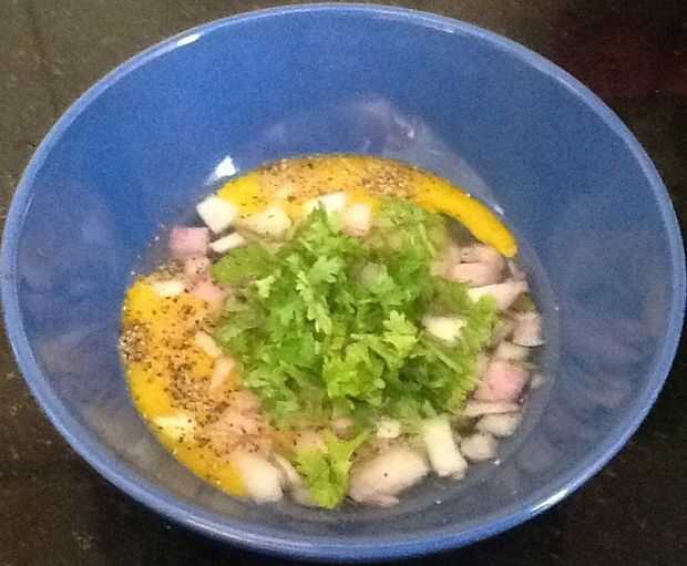 Para hacer la masa, romper dos huevos en un bol. Añadir la cebolla picada, hojas de cilantro picadas, polvo de pimienta y sal. Mezclar y batir bien. Ahora agregue la harina. Otra vez, batir bien hasta que el bateador se convierte en uniforme.
