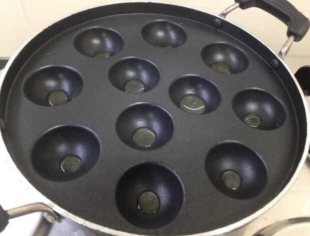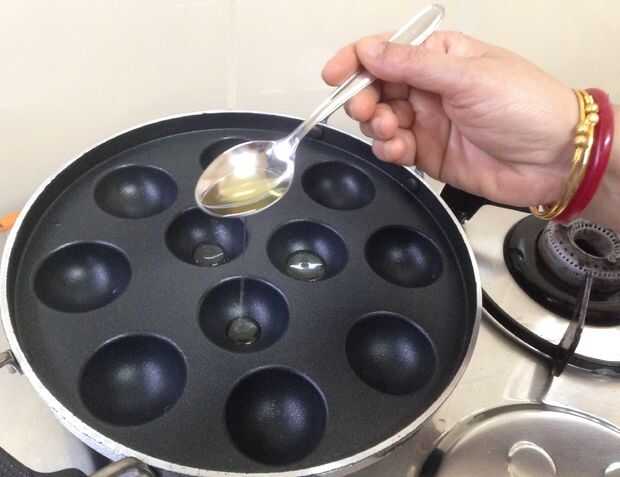Pre calentar Paniyaram Pan en fuego lento. Una vez que la sartén esté caliente, poner unas gotas de aceite en cada molde de pan.