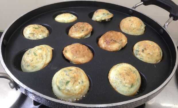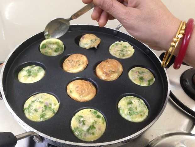 Tirón de las mordeduras de huevo para la cocción uniforme como se muestra en las figuras. Déjelo freír por otros 3 minutos. Si es necesario voltearlos dentro de los moldes hasta que todas se fríen bien.