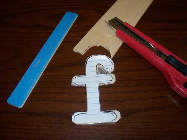 Con el tamaño relativo en la mente, sorteo/ajuste la letra "f" de la madera de balsa (o cartulina).