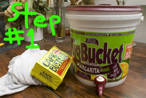 1. café (duh) alrededor de 6-8oz por galón tamaño contenedor, ajuste según sea necesario para su contenedor.