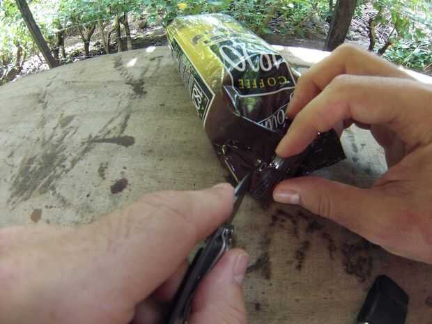 Si no puede encontrar (o hacer) un embudo (de papel), un método para obtener el café en la botella es para cortar la bolsa de café de la manera que se muestra para darle un pequeño surtidor de introduzca en la abertura de la botella. Para hacer eso...