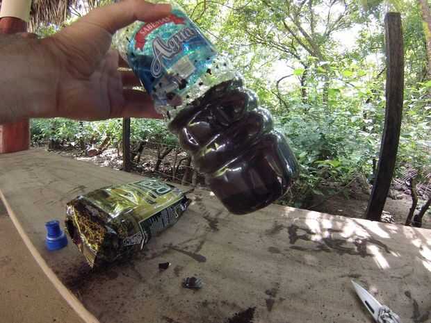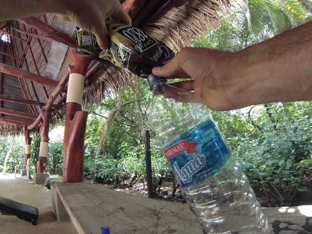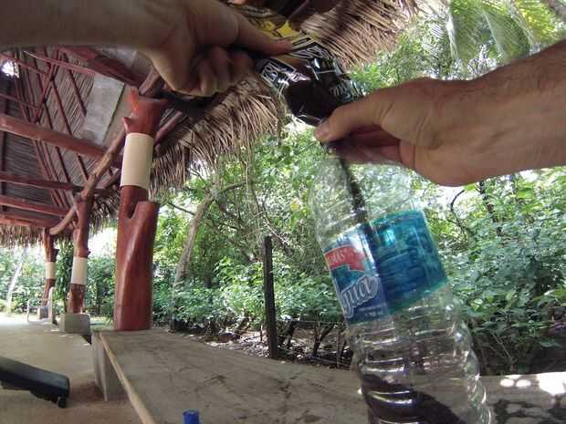 - Coloque la boquilla en la abertura de la botella vacía y volcar lentamente el recinto