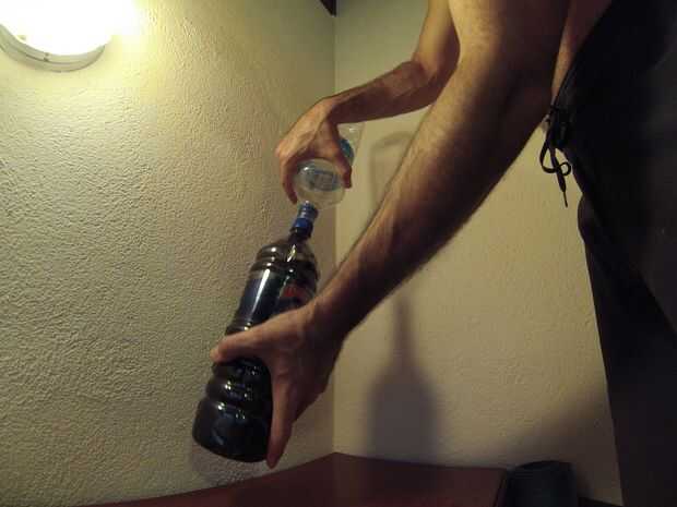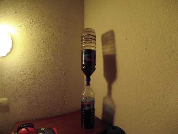 Ahora que el café ha sido "filtrando" por un día, es el momento a filtro hacia fuera de los terrenos y llegar a las cosas buenas. Asegúrese que el casquillo de los deportes está en la botella llena de café. Abra la tapa y coloque la punta de la botella vacía. Con la botella dos "enganchado", cuidadosamente de vuelta los dos, así que ahora que es la botella vacía en la parte inferior. Situado en una esquina y lean algo contra la botella superior para mantenerlos en su lugar. Cuidadosamente con un objeto afilado, haga un orificio en (lo que es ahora) la parte superior de la botella con los motivos. Esto permitirá que el aire venga a sustituir el café comienza a drenar hacia fuera a través del casquillo de los deportes en la botella vacía del receptor. Algunos motivos podrían pasar a la botella vacía, pero los motivos deben eventualmente obstruir el casquillo de los deportes y solo café líquido pase a través. LA OBSTRUCCIÓN ES UNA BUENA COSA.