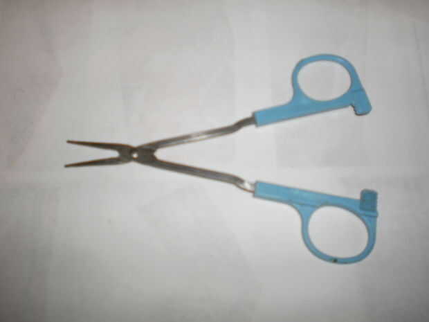 La pinza hemostática que he ilustrado es uno de mis viejos. Tengo algunos cromado totalmente de metal en algún lugar sobre mi mesa de trabajo :-) Note que en el mango, donde van los dedos, las "pestañas". Realmente son acanalados y servirá de presión ajustable de los mecanismos de sujeción.