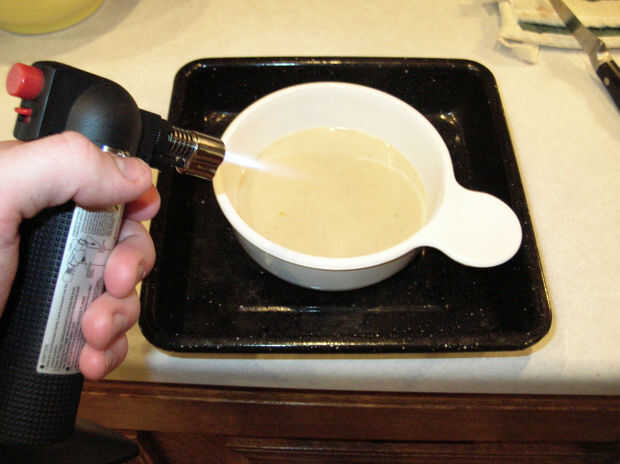 Una vez completada la mezcla de flan, vierta en moldes hasta una profundidad de aproximadamente 1/2 pulgada. Un soplete de cocina puede usarse para eliminar las burbujas.