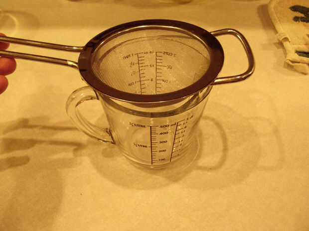 Si no desea pequeños motivos para convertirla en producto terminado utilizan un paño de queso o filtro de café como un filtro. * Nota * más fino esfuerzo aumentará el tiempo de filtro y deberás subir la mezcla a la temp.