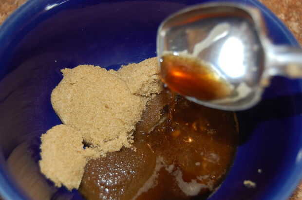 Mezcle el azúcar morena y café caliente. El café debe ser suficiente para fundirse el azúcar y hacer un almíbar delgado fuera de él.